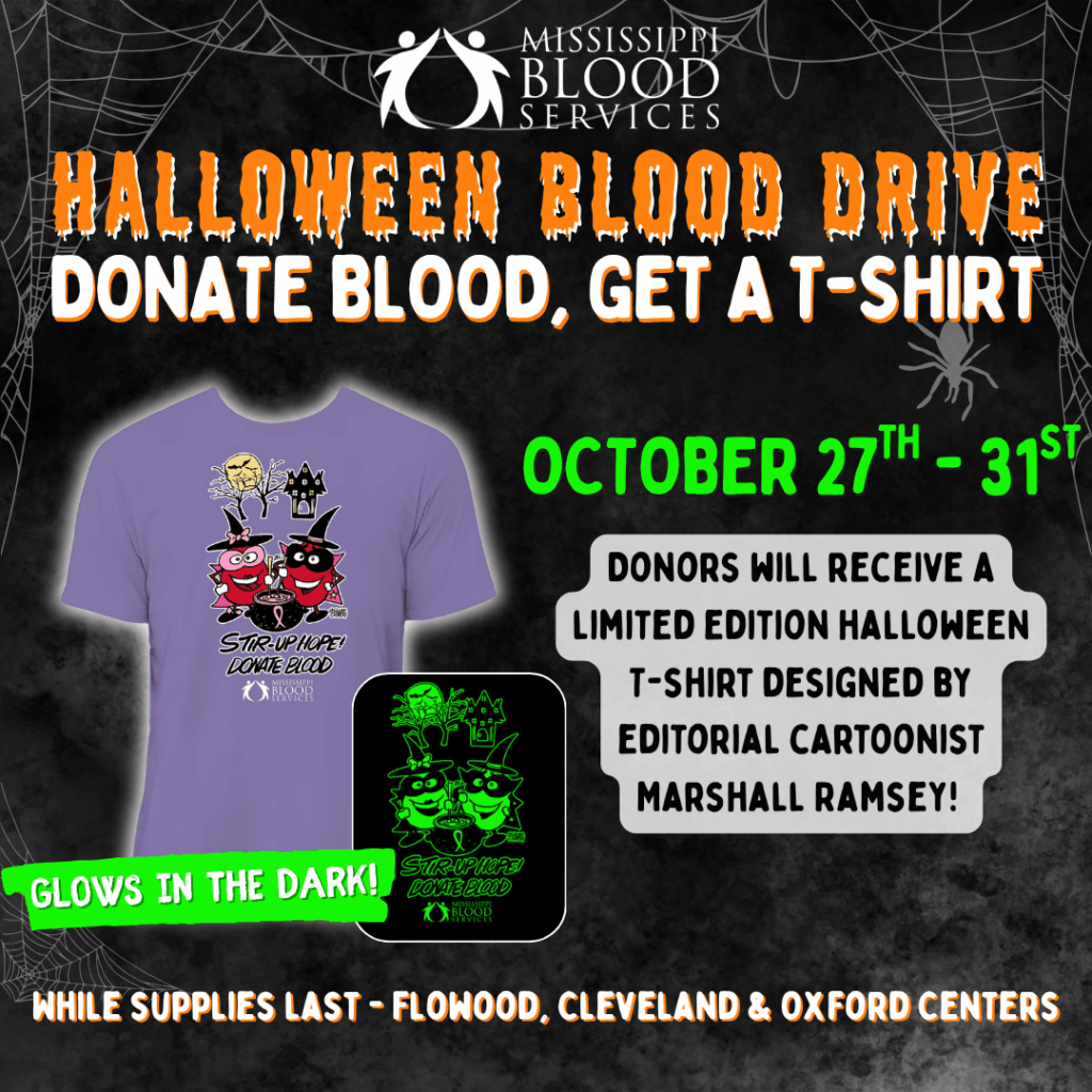 This Halloween, Mississippi Blood Services invites you to do something truly life-changing — donate blood and help save lives. From October 27th through 31st, every donor will receive an exclusive glow-in-the-dark Halloween T-shirt as a thank-you for supporting patients and families across Mississippi.
